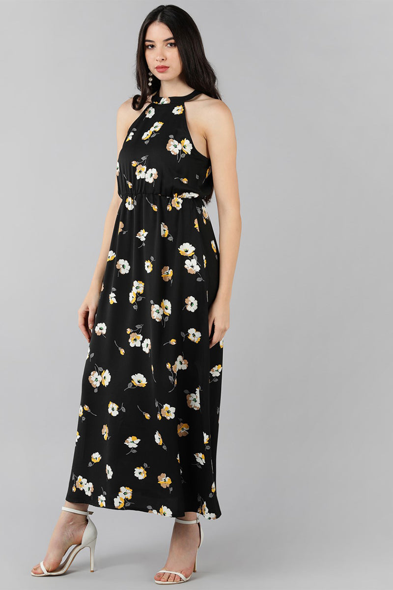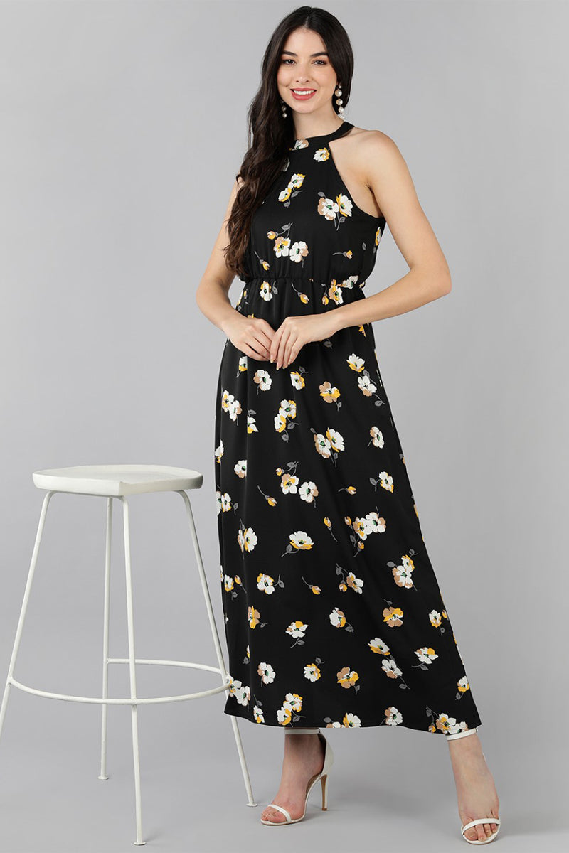 Make heads turn wearing this gorgeous Black Floral Printed Dress! This maxi dress is the perfect addition to your wardrobe for casual or party occasions. Featuring a round neck, sleeveless design, and a maxi length in a flared hem, this dress is made with a lightweight georgette fabric for a comfortable fit and feel.