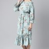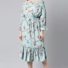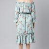 Blue Crepe Floral Print Off-Shoulder Midi Dress