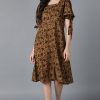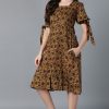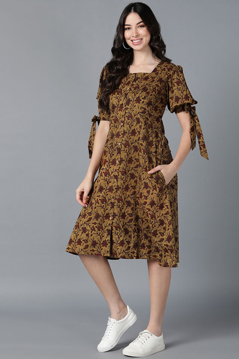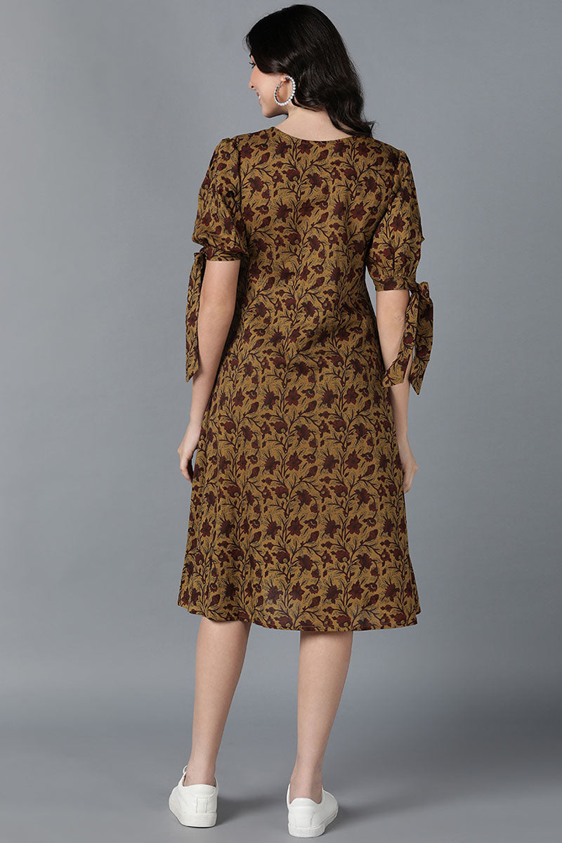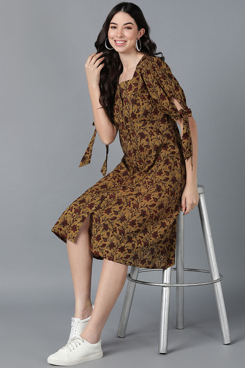 Show off your style and flaunt a beautiful floral look with our Mustard Cotton Printed Dresses. This beautiful A-line dress is made with a blend of cotton and woven fabric and features an empire neckline and knee-length hem.
