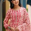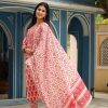 Step into the world of floral elegance with our pink Rayon Blend floral printed suit set. It features a round embroidered neckline with three-quarter sleeves. It has a straight hemline with side cutouts. It is paired with printed bottoms and a printed dupatta.